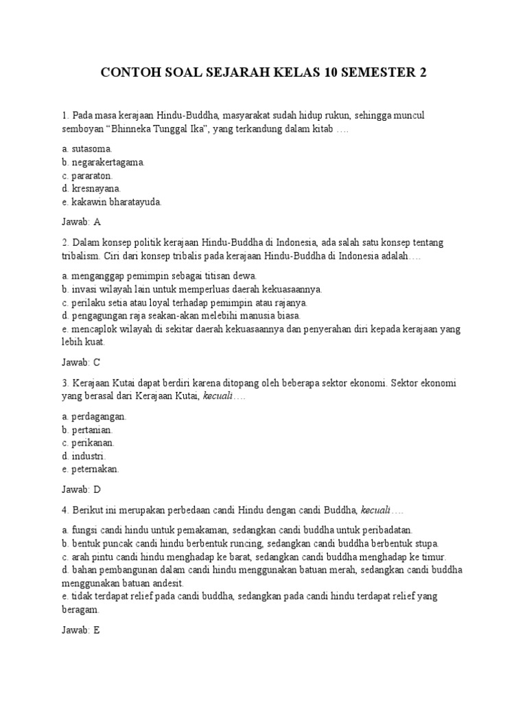 Sejarah merupakan studi tentang masa lalu yang membentuk peradaban manusia. Memahami sejarah tidak hanya sekadar menghafal tanggal dan nama, tetapi juga menganalisis peristiwa, memahami konteks sosial, politik, dan ekonomi, serta menarik pelajaran dari masa lalu untuk masa depan. Artikel ini menyediakan latihan soal sejarah kelas 10 semester 2 beserta jawabannya, yang mencakup materi-materi penting seperti Kerajaan-Kerajaan Hindu-Buddha di Indonesia, Perkembangan Islam di Indonesia, dan Kolonialisme Eropa. Latihan soal ini bertujuan untuk membantu siswa dalam mempersiapkan diri menghadapi ujian dan meningkatkan pemahaman tentang sejarah Indonesia.